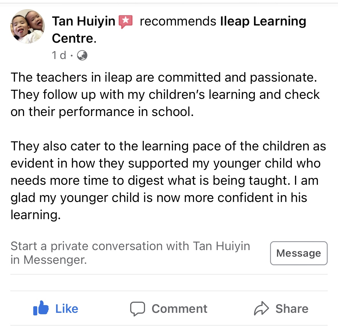 My son has been tutored by iLeap for about a year now. He struggled with English during his first term in Primary 4 without any tuition and his result dipped greatly. Luckily, I enrolled him in all subjects in iLeap some time early last year and the rest is history. His results improved tremendously in Primary 4 and he has been getting distinction for all of his subjects every term since he has started his tuition with iLeap. Besides, the tutors are very patient to guide him in his weaker areas. The lessons are very engaging and my boy even volunteers to attend additional classes. I am very grateful to the tutors who have taught him. Thank You!