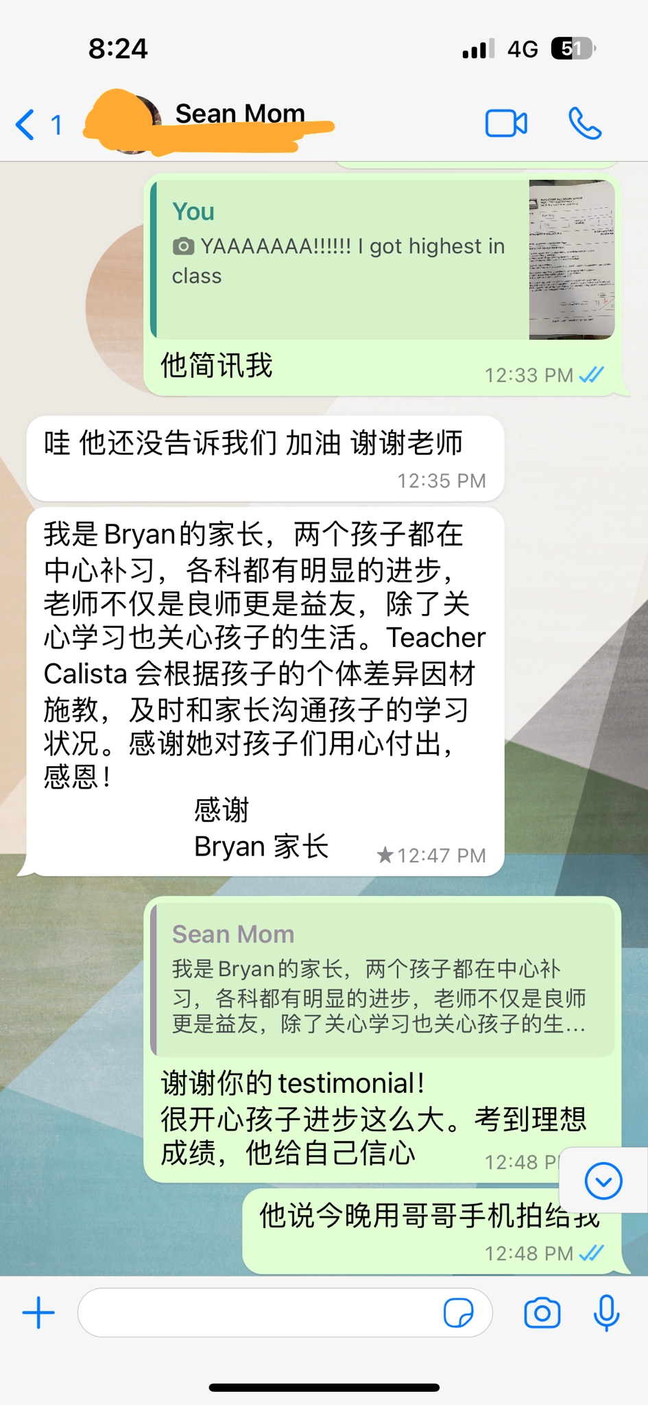 Bryan did not get a good chance to improve on his Maths in the Primary School years and he went straight to the Normal Academic Stream. What makes a difference is that the teacher in ILeap maintains a good relationship with my child. She is not just a mentor but also a friend. My child mentions that he enjoys going for classes. Teacher Calista provides timely updates on my child's progress and communicates clearly if my child is falling behind in class. She tailors the learning to my child's pace and ensures that he is not left behind. I am really very grateful to her and hopes that she continues to coach my child till he graduates from Secondary School .